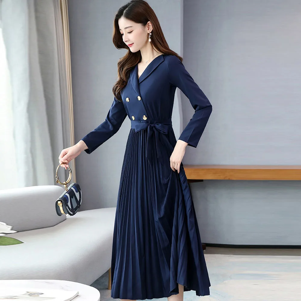 Images of Office Ladies Party Pleated Dress Elegant Women Belt Aline Royal Blue Fashion Work Wear Midi Dresses Female Vestidos Spring 2020 :