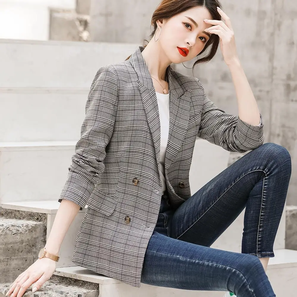 Promo Female Elegant Formal New Fashion Women Blazer Jacket Fall Winter Gray Apricot Plaid Girl Work Wear Long Sleeve Double Breasted