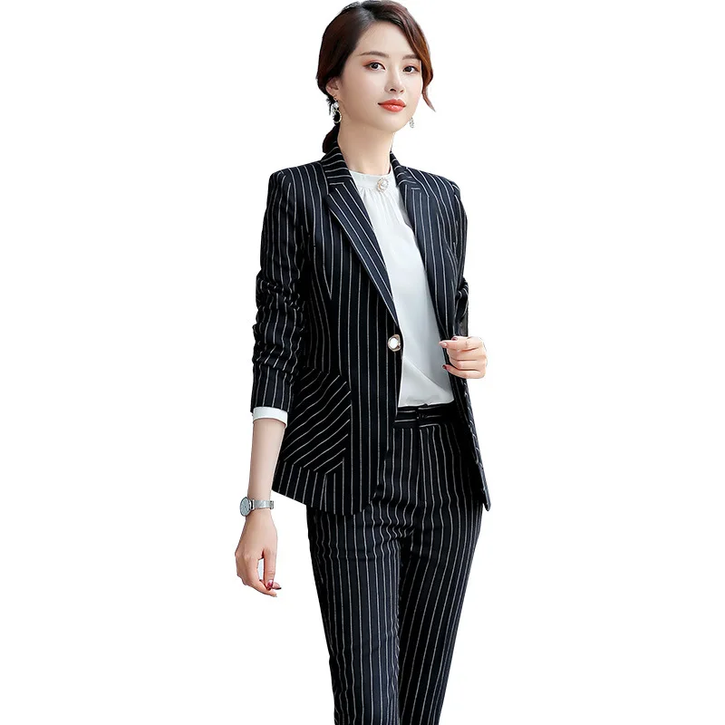 Buy Female Elegant Stripe Formal Office Work Pant Suits 2 Pieces Set for Women's Suit Set Blazer and Trouser Pant Business Clothing