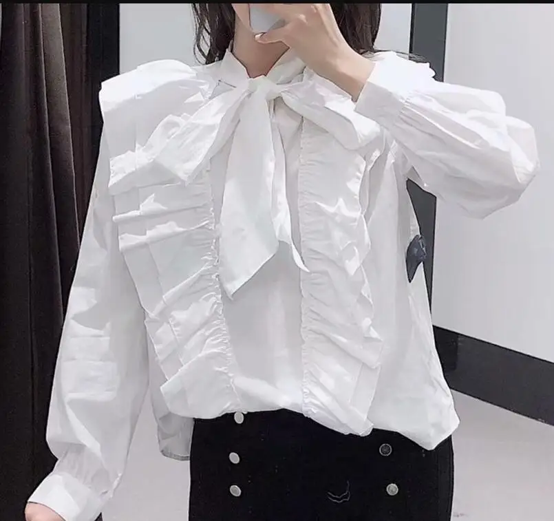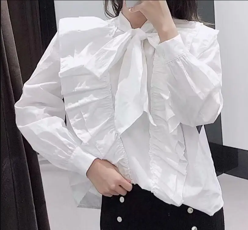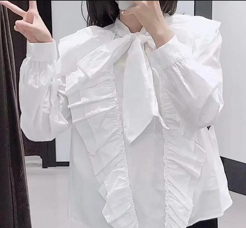 Images of 2020 white blouses long tops Ruffle Blouses Women Fashion Bow Solid Shirts Women Elegant Long Sleeve Poplin Tops Female Ladies :