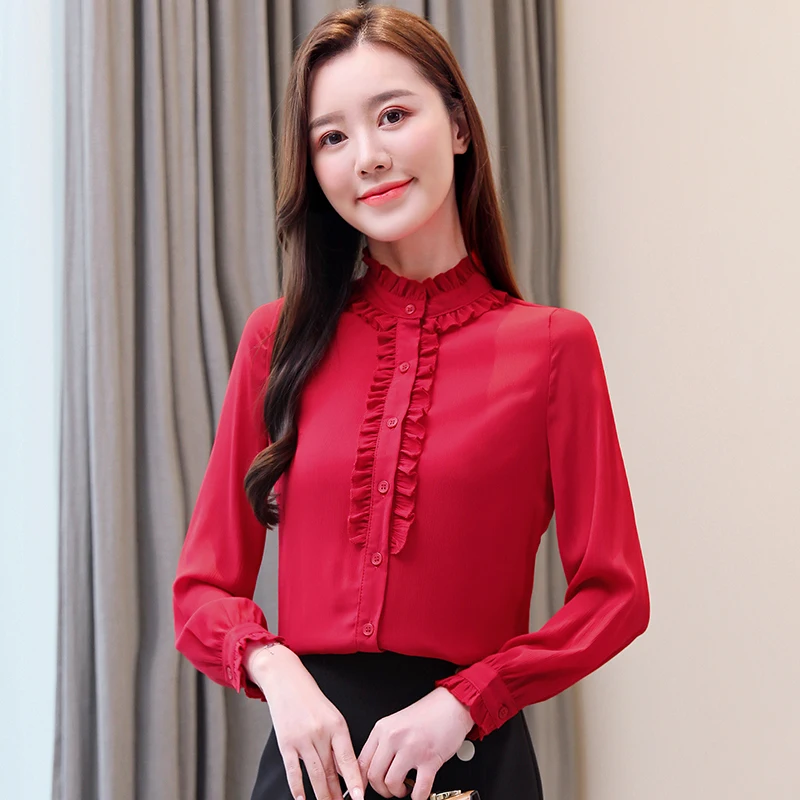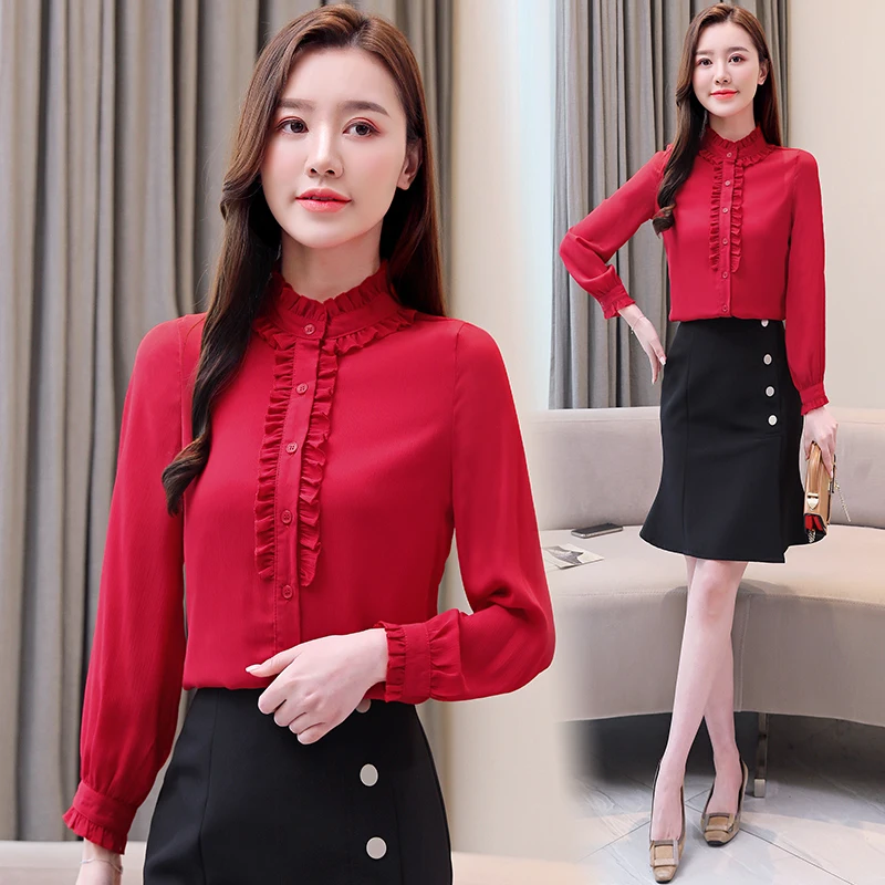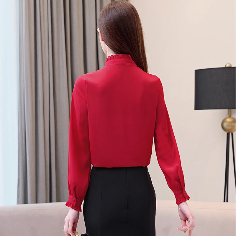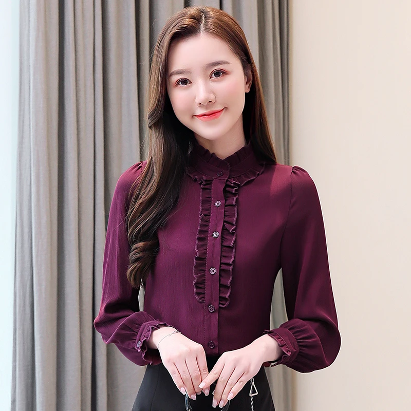 Images of Slim Solid Shirt Women Long Sleeve Stand Collar Ruffles Blouse Lady Elegant Temperament Vintage Female Tops White Tunic 2020 New :