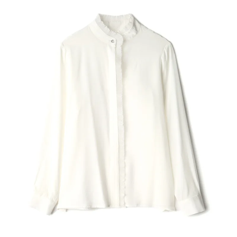 Images of White Ladies Blouses 2020 100% Natural Silk Long Sleeve Shirt Woman Ruffled Shirts Stand Office Lady Feminine Clothes :