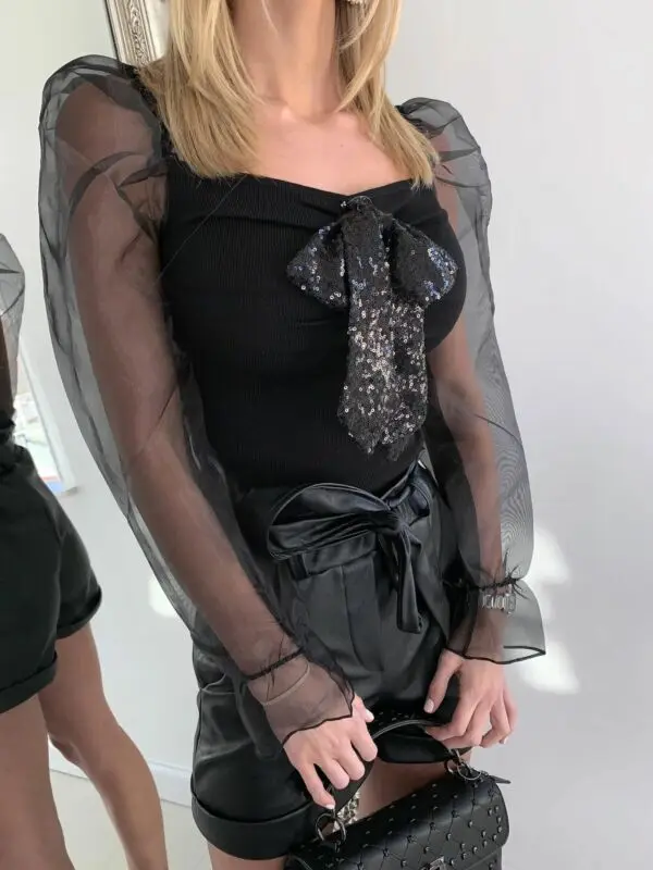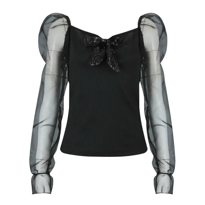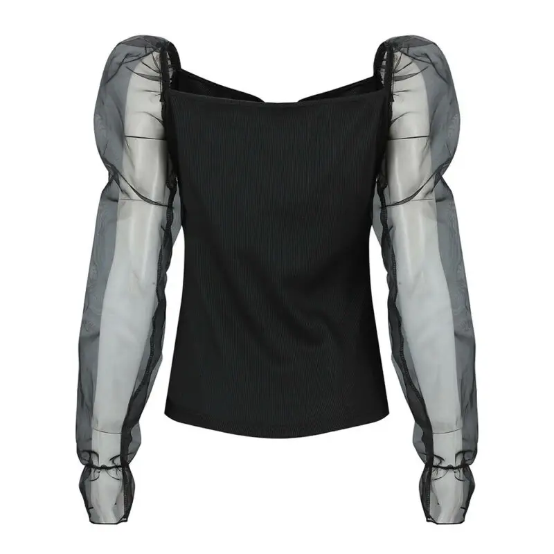 Images of 2020 Fashion Women See Through Mesh Long Puff Sleeve Square Neck Blouse Tee Shirt :
