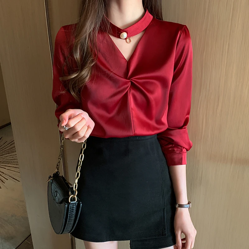 Best Offer Korean Women Silk Blouses Women Satin Shirts Elegant Woman Long Sleeve OL Shirt Plus Size Woman V Neck Blusas Femininas Elegante