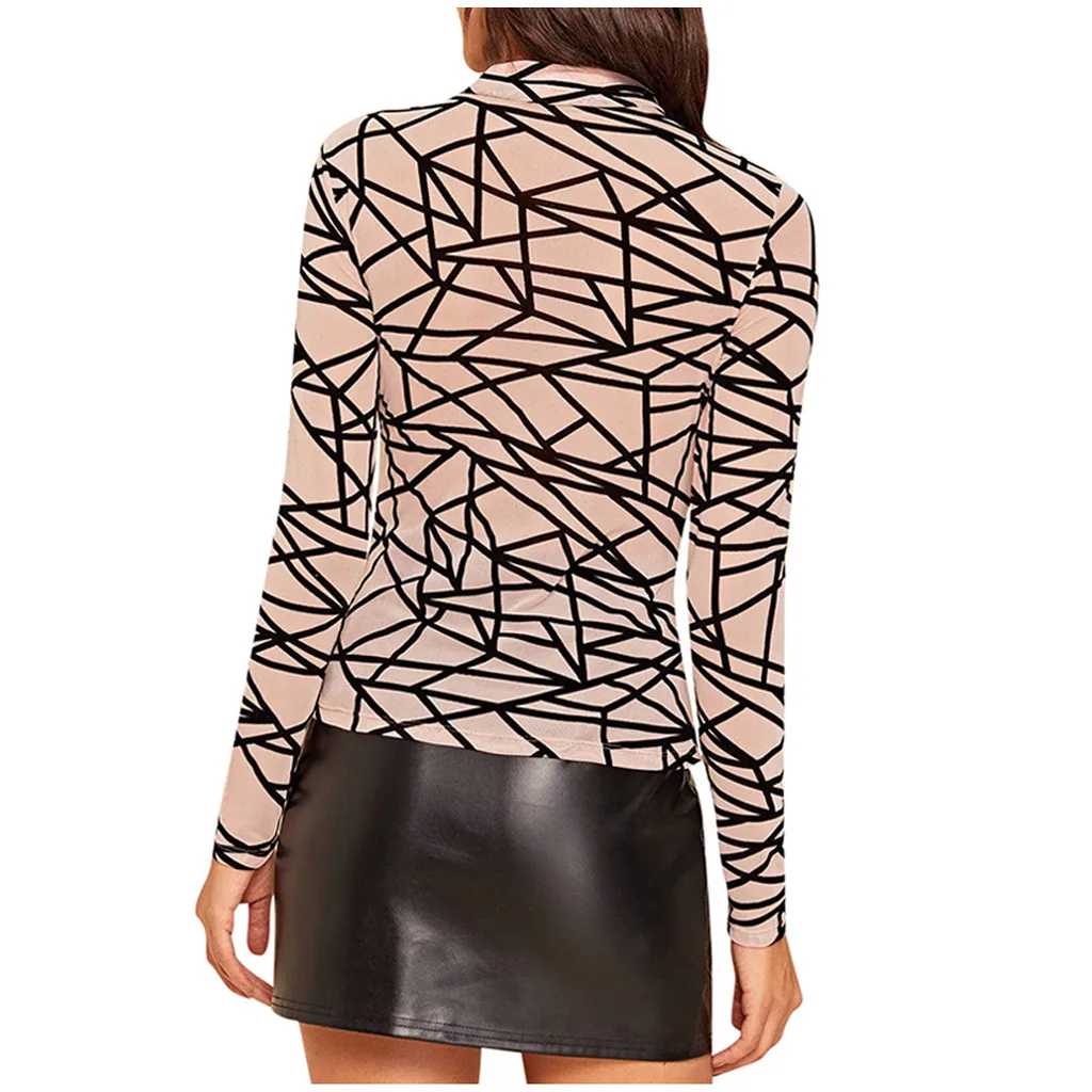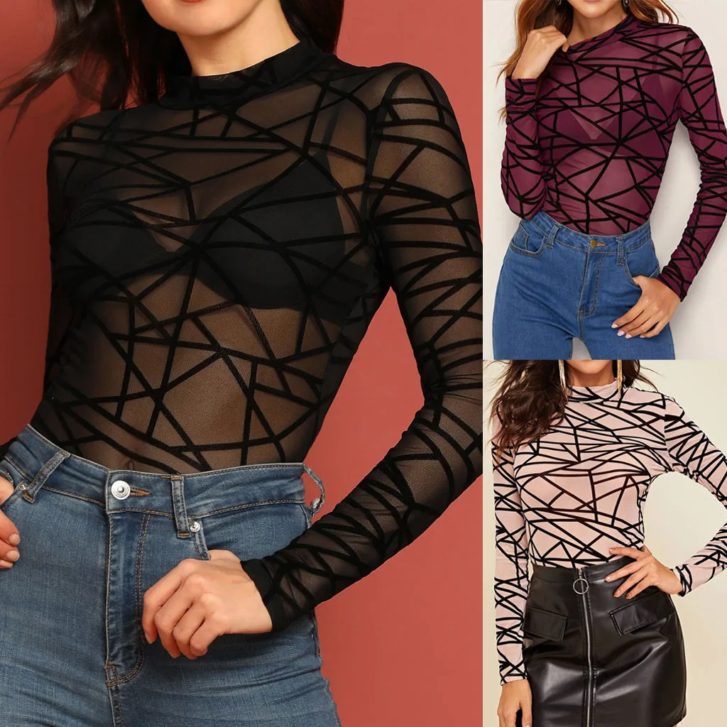 Images of Perspective Casual Slim Top 2020 New Women Sexy O-Neck Long Sleeve Mesh Blouse Shirts Girls Lady Summer Becah Top Covers :