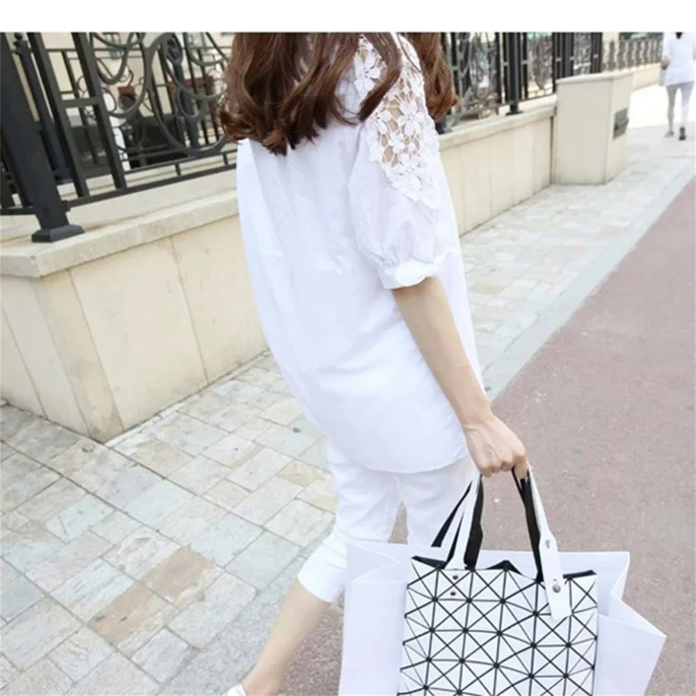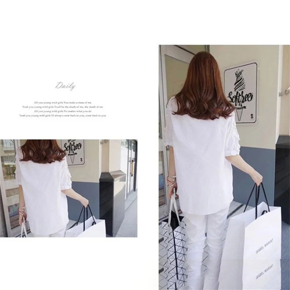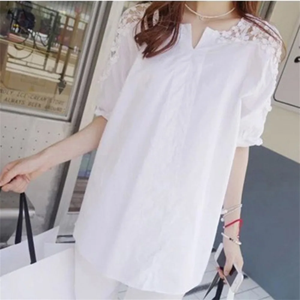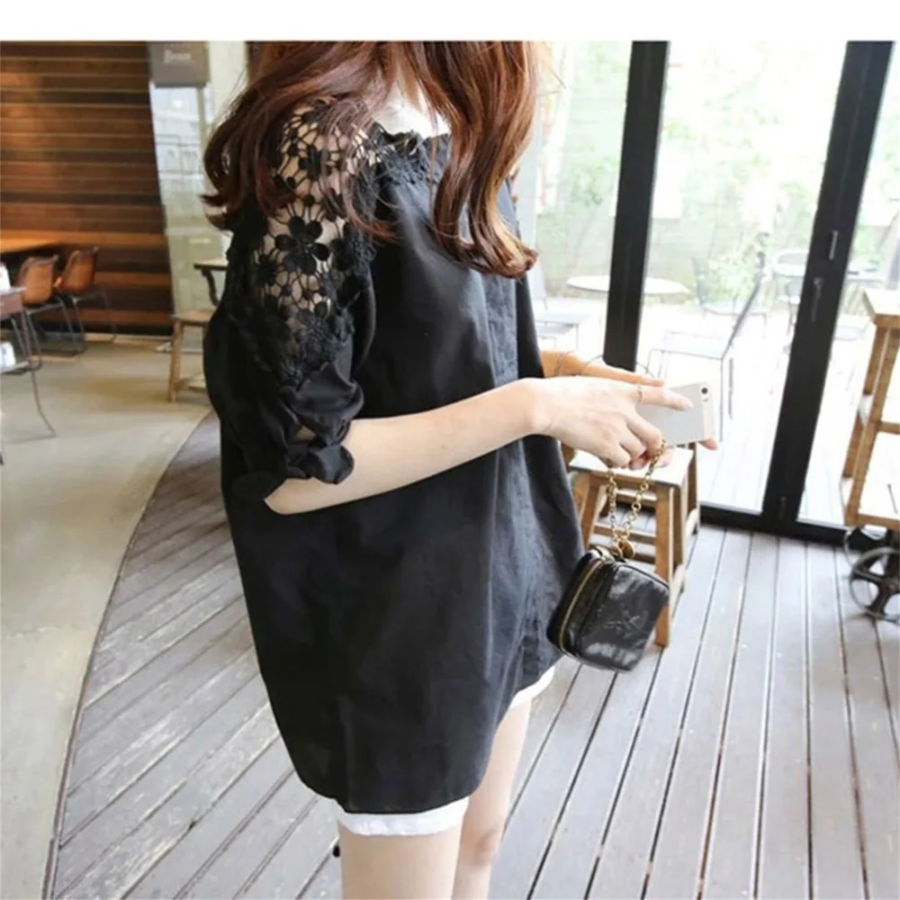 Best Offer Summer Women White Hollow out Blouse Cotton Solid Color Long Section Lace Shirt Tops Lace Stitching Elegant Shirt Plus Size 5XL