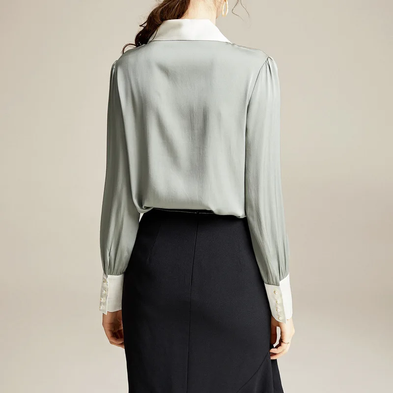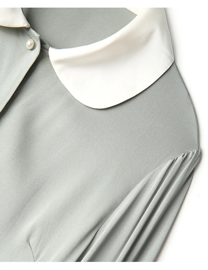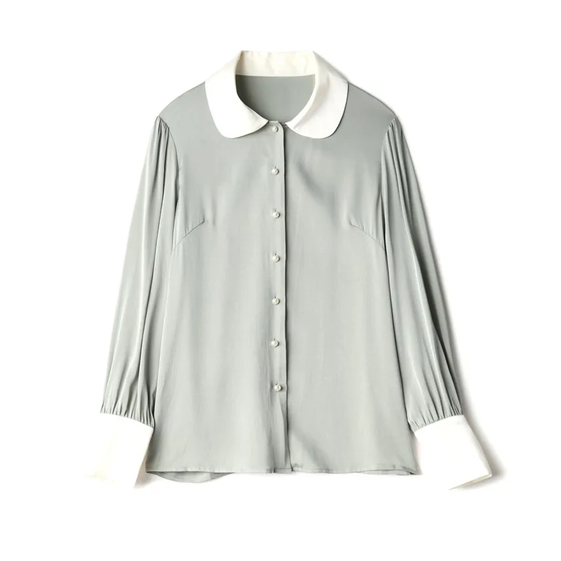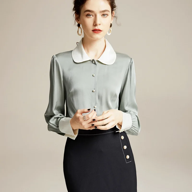 Images of 100% Natural Silk Womens Clothes Blouses 2020 Spring Long Sleeve Peter Pan Collar Women's Green Shirt Ladies Tops :