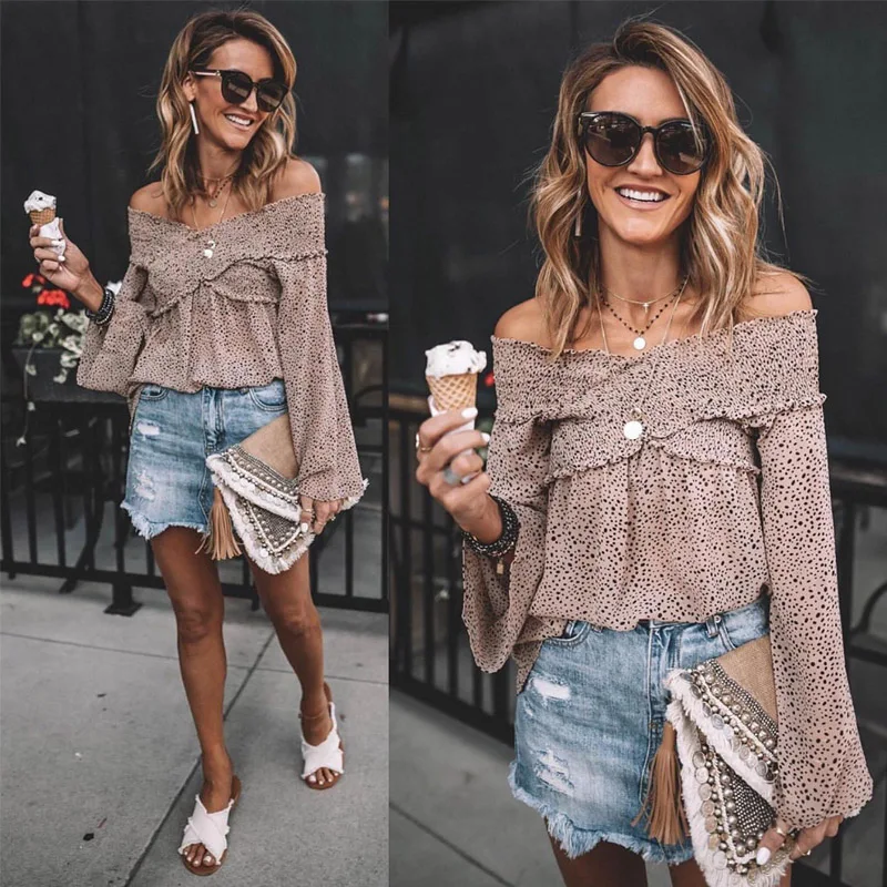Images of Aproms Vintage Polka Dot Print Off Shoulder Shirt Women Spring Summer Long Sleeve Fashion Tops Ladies Streetwear Blusas Mujer :