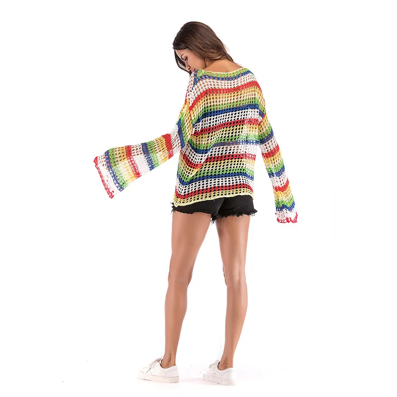 Images of Slash Neck Long Sleeve Spring Tops and Blouse Plus Size Rainbow Striped Knit Hollow Clothes Sweater Women's Loose Pullover Tops :