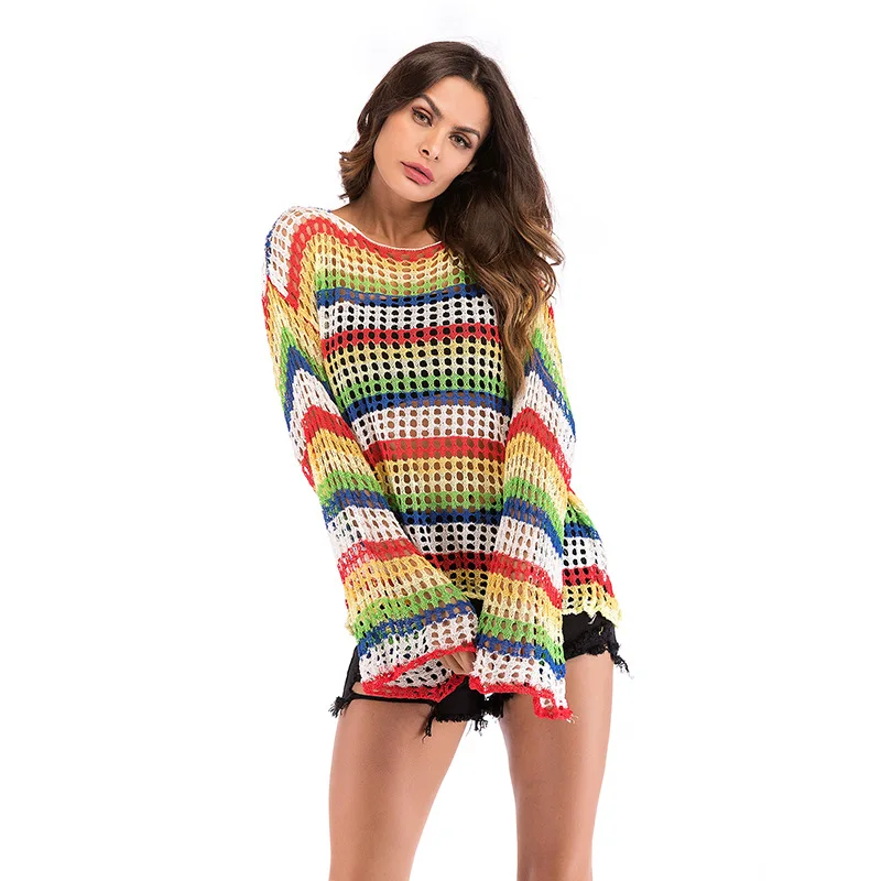 Get this Slash Neck Long Sleeve Spring Tops and Blouse Plus Size Rainbow Striped Knit Hollow Clothes Sweater Women's Loose Pullover Tops with limited time discount by pressing the button below