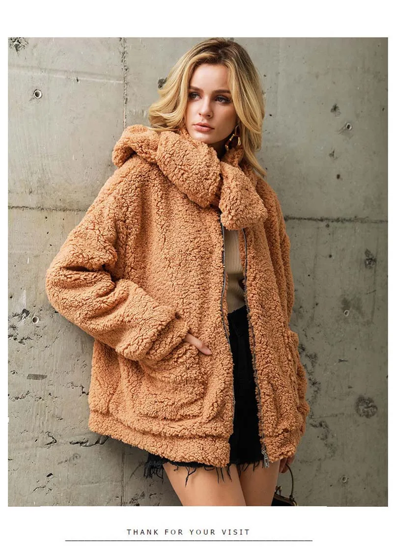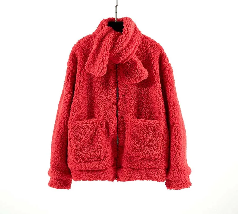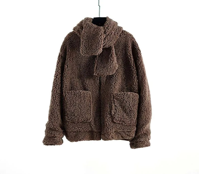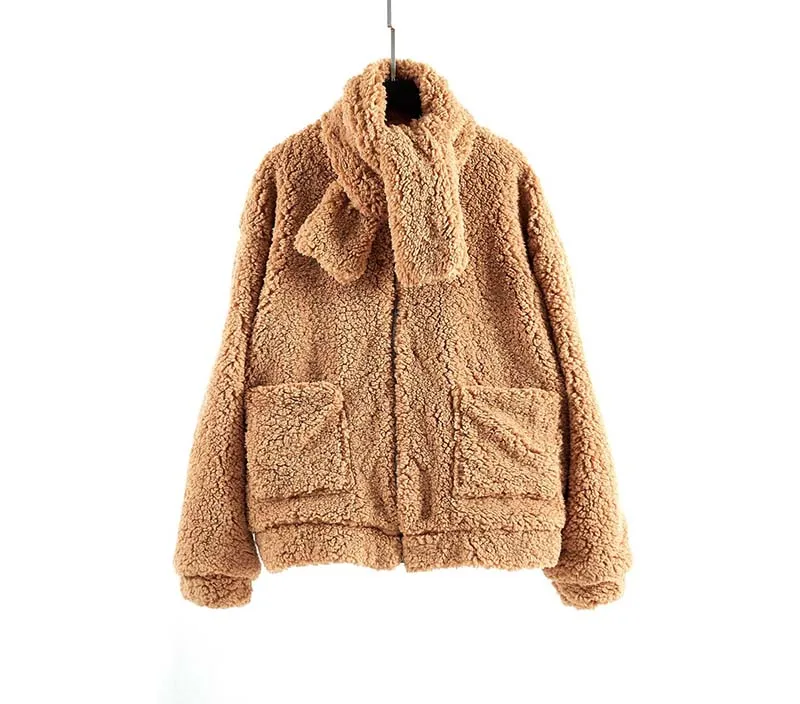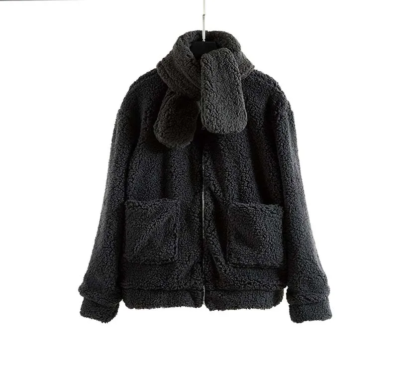 Buy Soft Zipper Fur Jacket With Scarf Female Plush Overcoat Casual Pocket Outwear teddy cozy Fashion Warm Lambwool Fur Coat Women