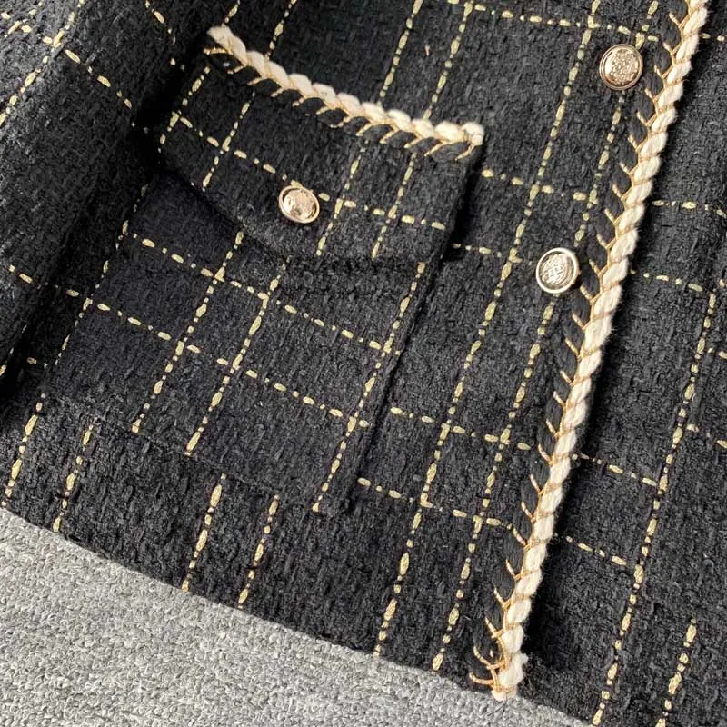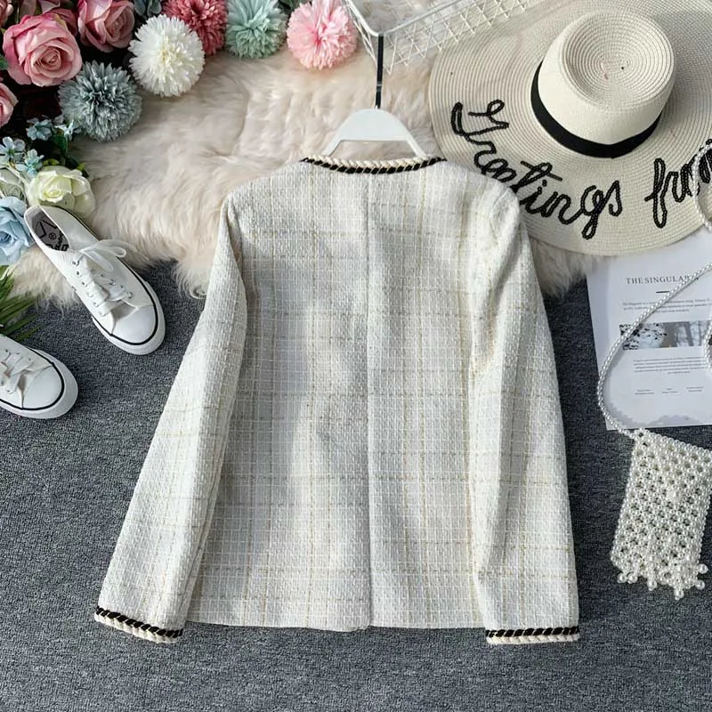 Images of Vintage 2019 Black White Single Breasted Jacket Autumn Winter Double Pockets Women Outerwear Elegant Long Sleeve V Neck Coat :