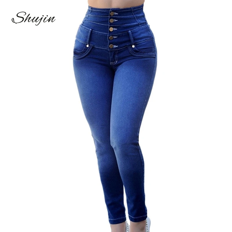 Images of JODIMITTY 2020Women Autumn Stretch High Waist Casual Straight-breasted Jeans Femme Slim Solid Denim Plus Size 3XL Jeans Pants :