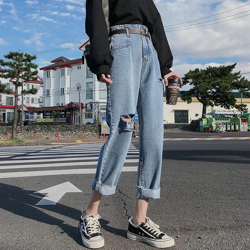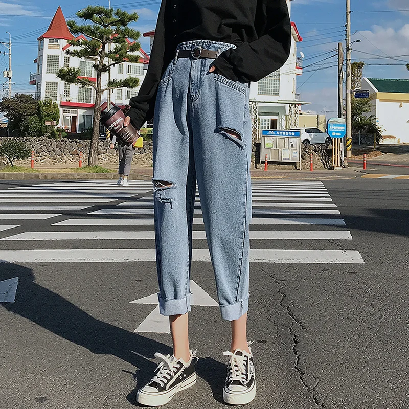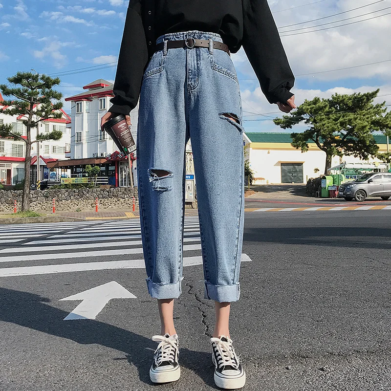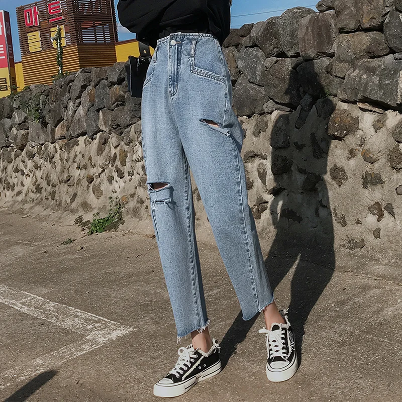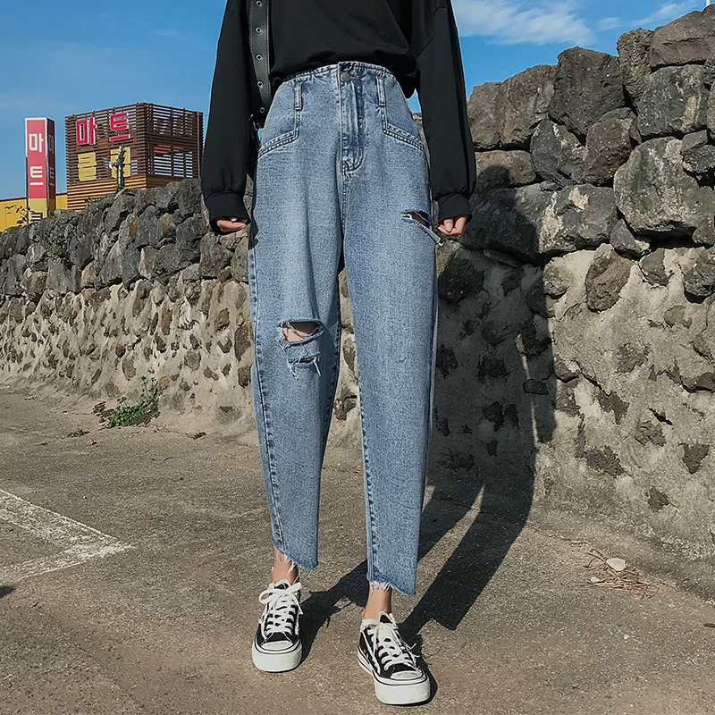 Promo Woman Elasticity High Waist Jeans Washed broken hole jeans blue Loose Ankle pants Jeans Denim Solid Tassel Cotton Harem pants