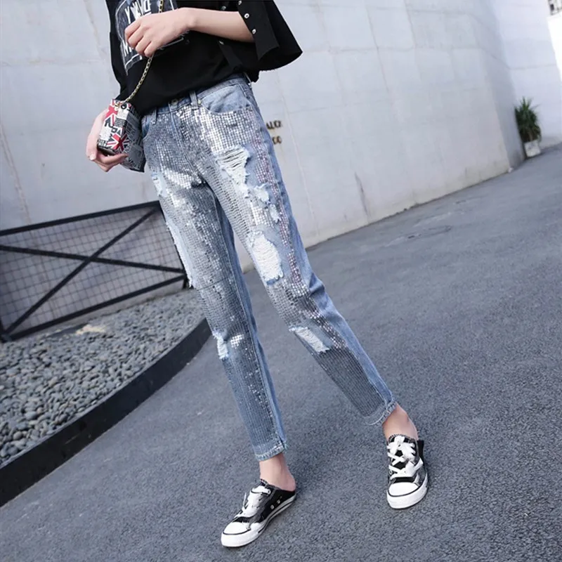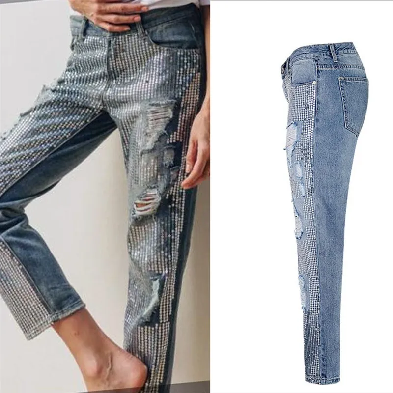 Promo Vintage New Boyfriend Jeans Hole Denim Sequined Tassel Jeans Mid Women Plus Size Ripped Denim Pants