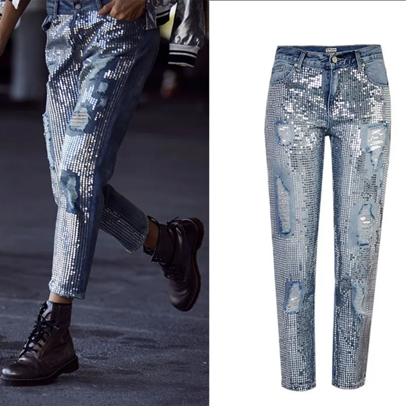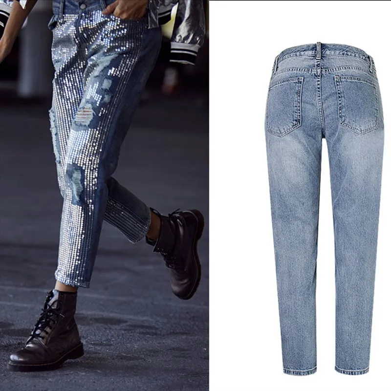 Images of Vintage New Boyfriend Jeans Hole Denim Sequined Tassel Jeans Mid Women Plus Size Ripped Denim Pants :