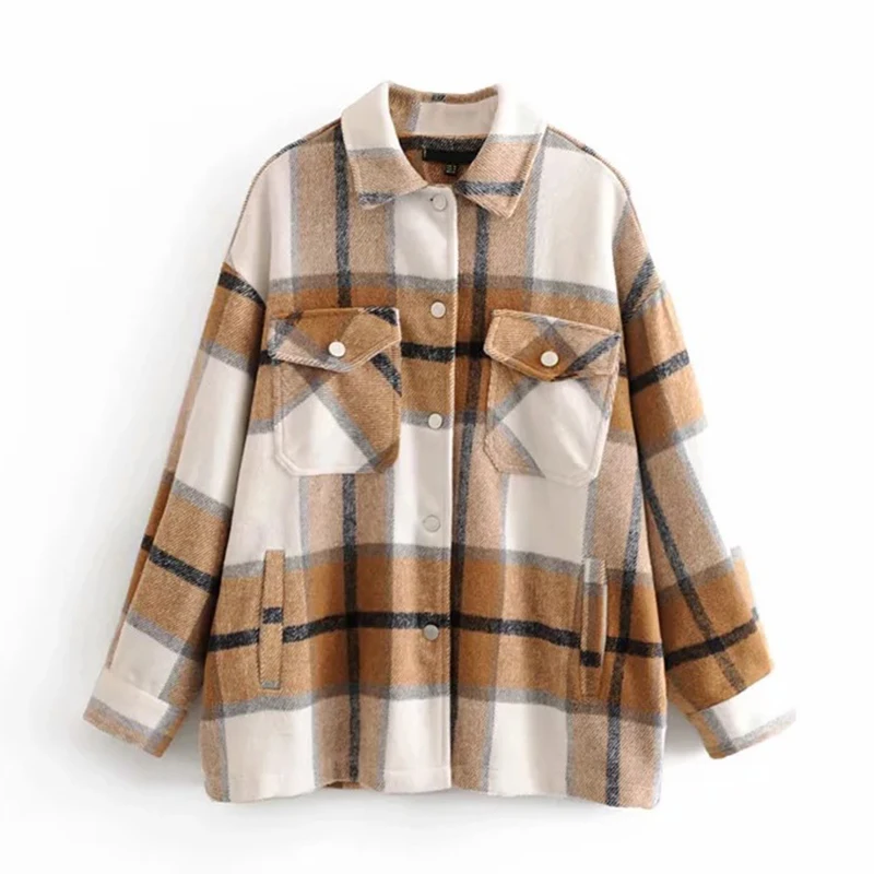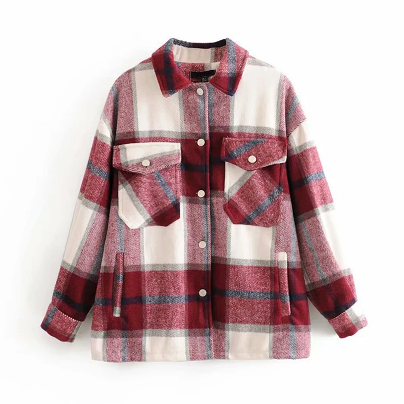 Buy Plaid Overshirt Wool Blend Jacket Check Lapel Collar Long Sleeve Coat Women Oversized Pockets With Flaps Button Jackets Tops