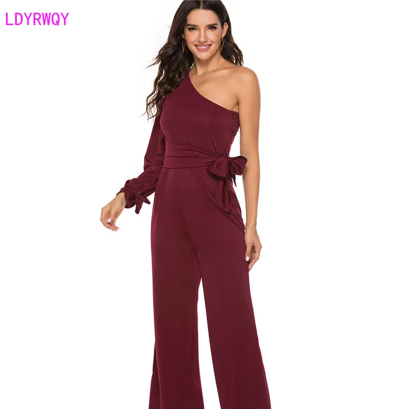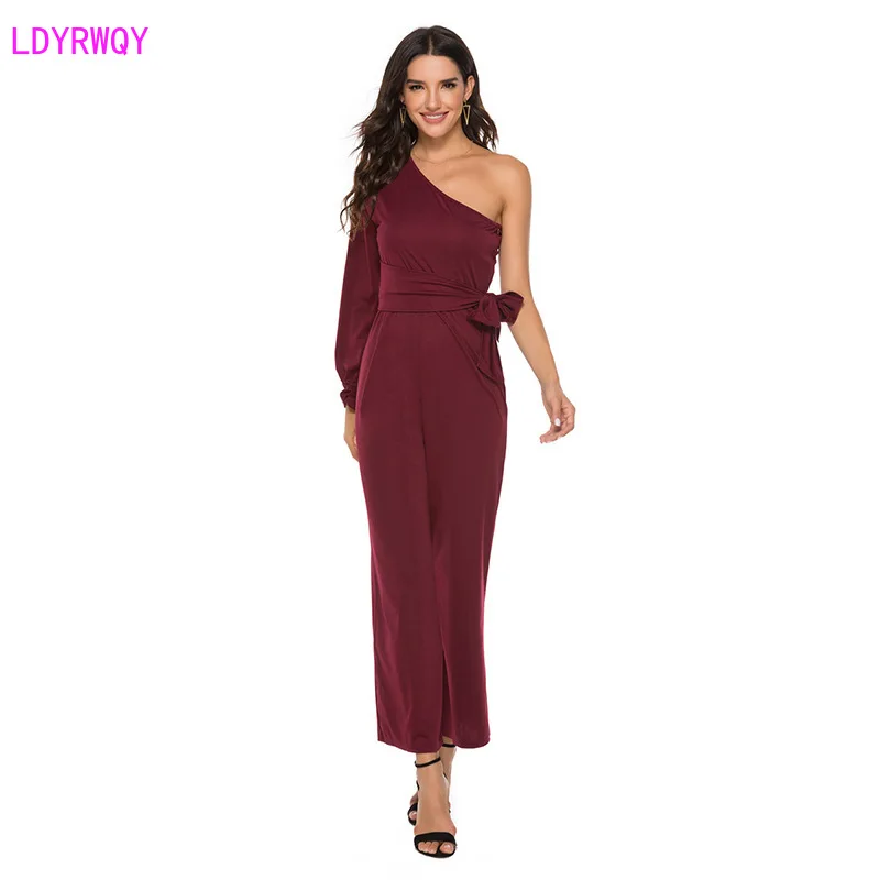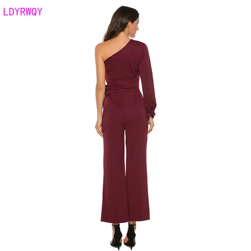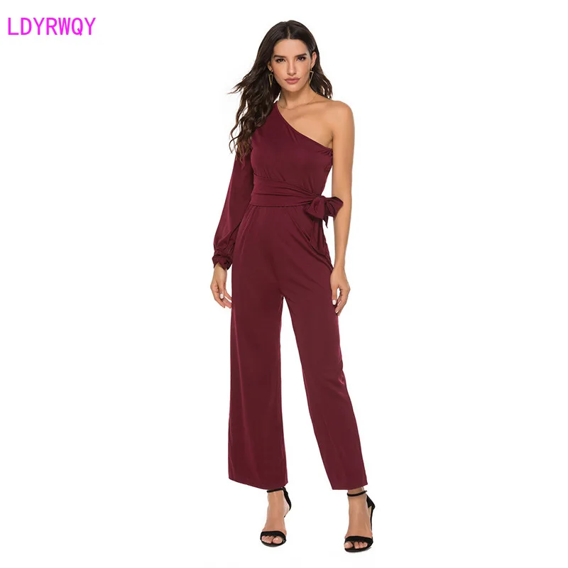 Promo 2020 spring and autumn new European and American women's fashion sexy one-shoulder strap solid color jumpsuit Straight