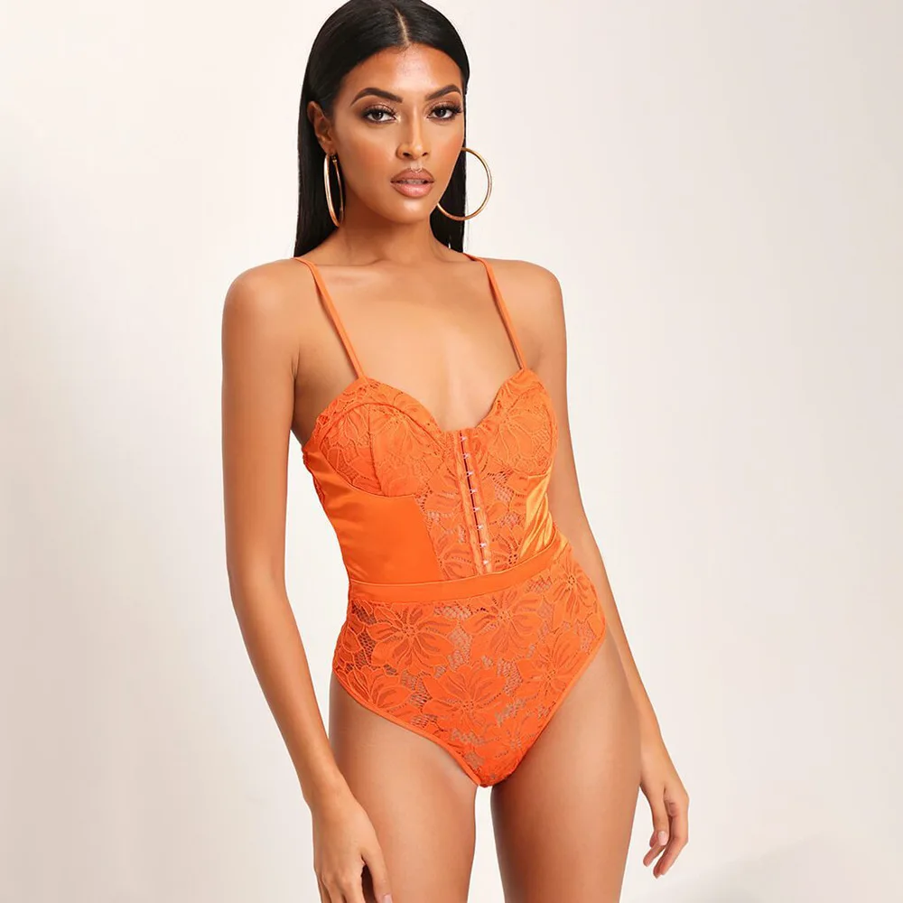 Images of Cryptographic Satin Sleeveless Spaghetti Strap Hooks Lace Bodysuit Sexy Skinny Solid Lace Teddy Hollow Out Floral Body Female :