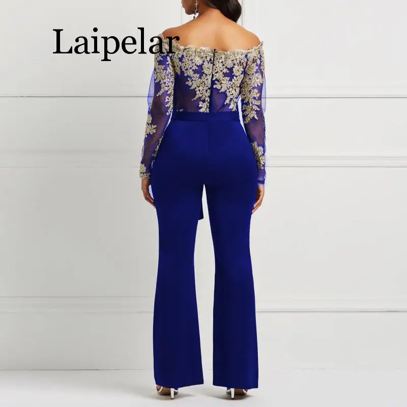 Images of Laipelar Women Jumpsuit Luxury Lace Patchwork Mesh Transparent Off Shoulder Autumn Winter Long Sleeve Wide Legs Sexy Jumpsuit :