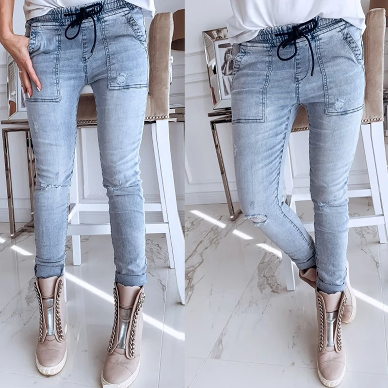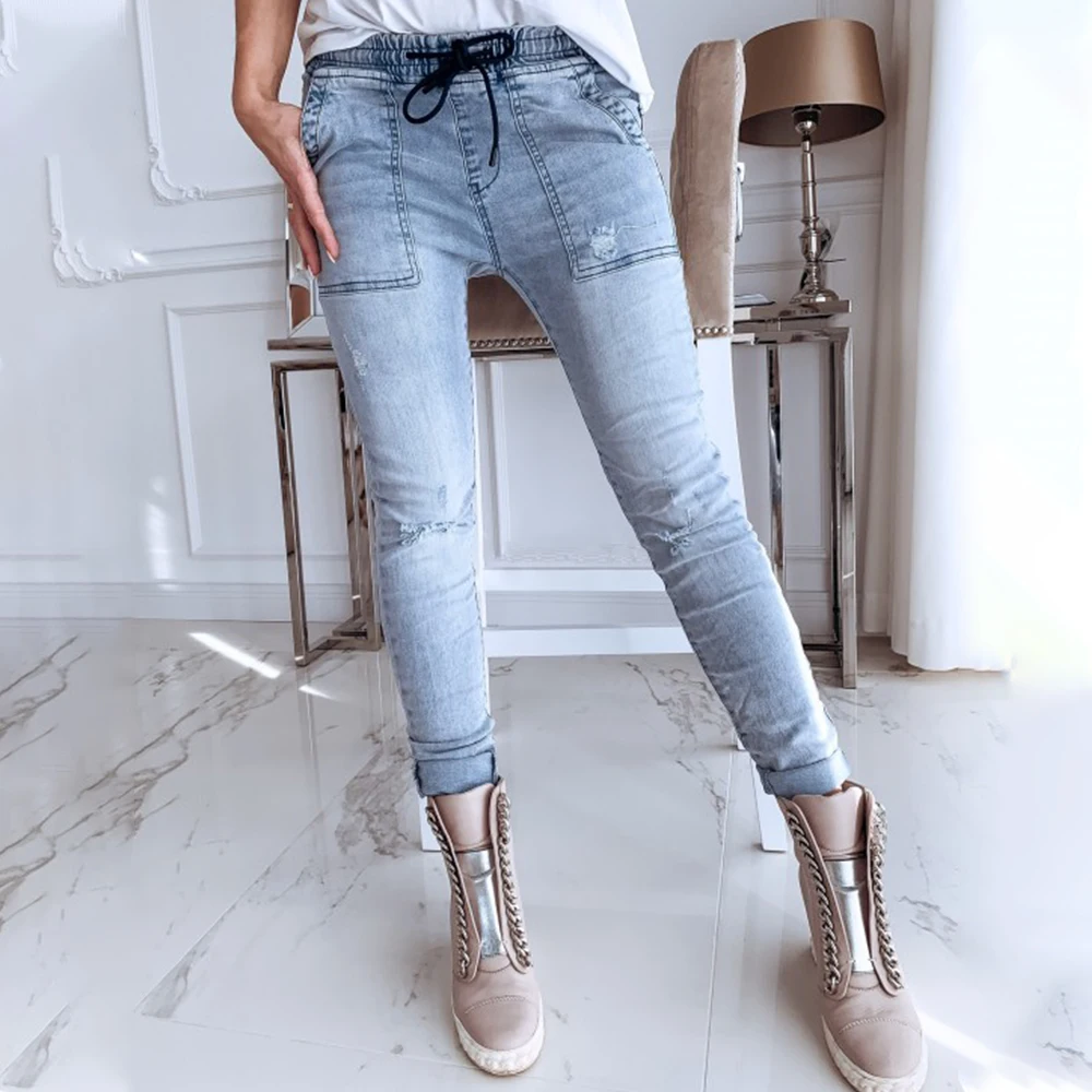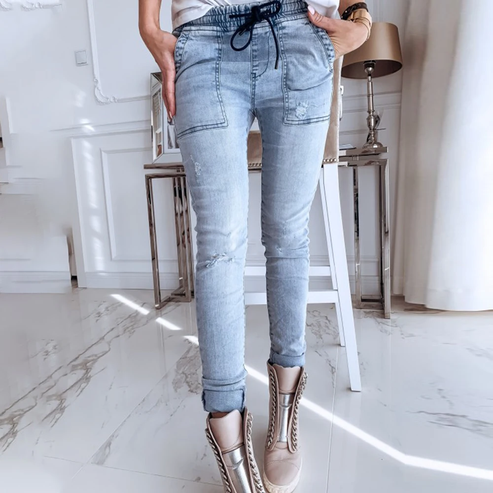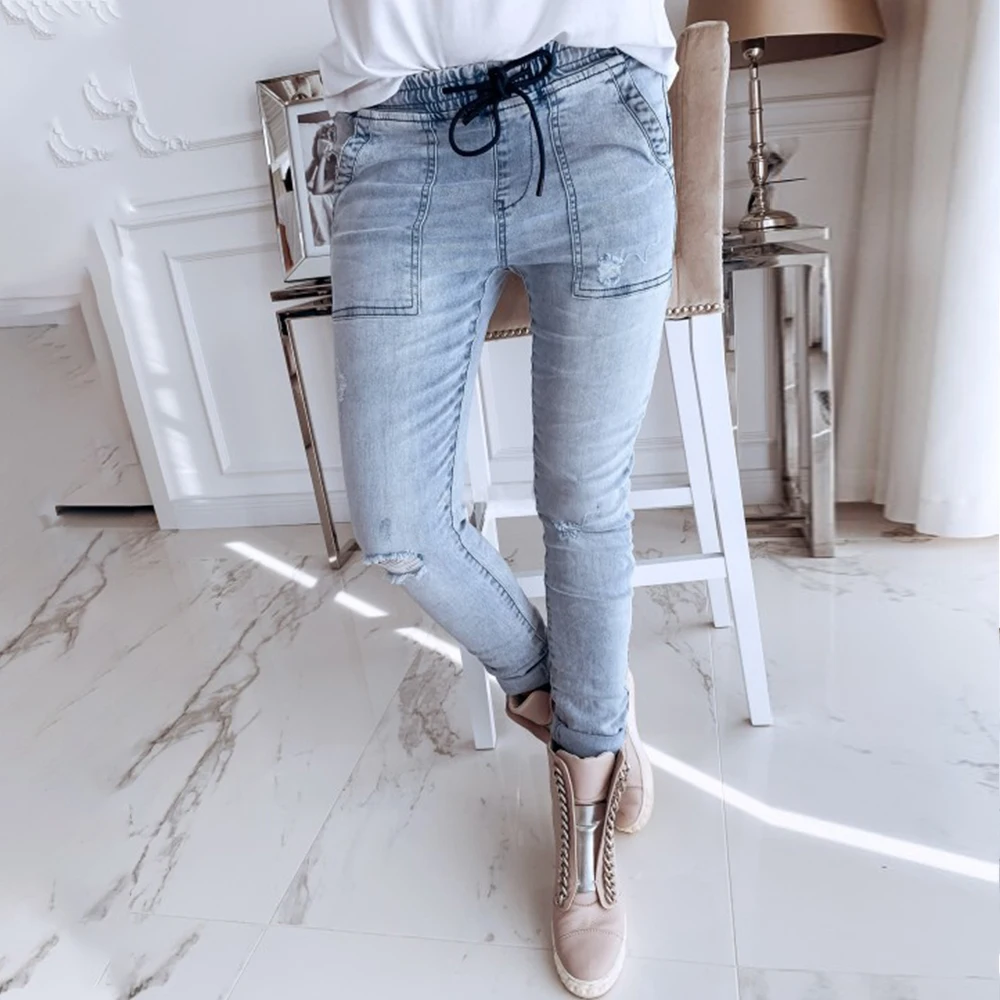 New Vintage Blue Jeans Women Low Waist Elastic Waist Lace up Denim Jeans Fashion Winter Pencil Full Length Trousers D30