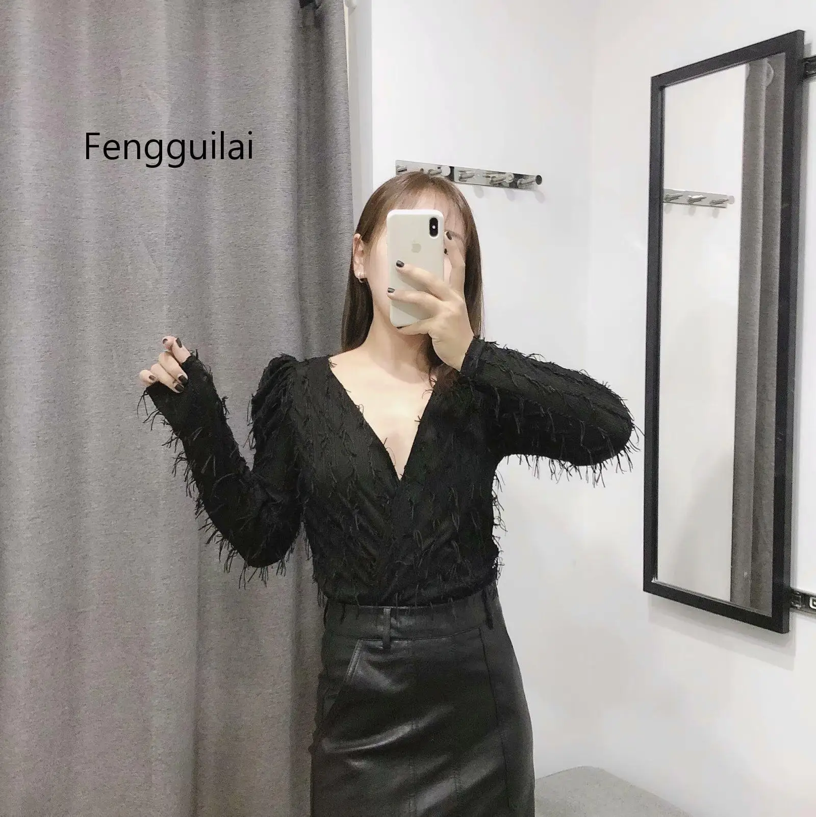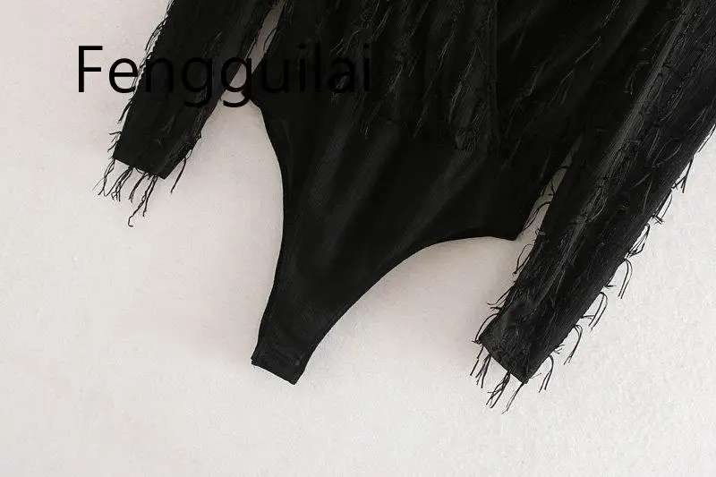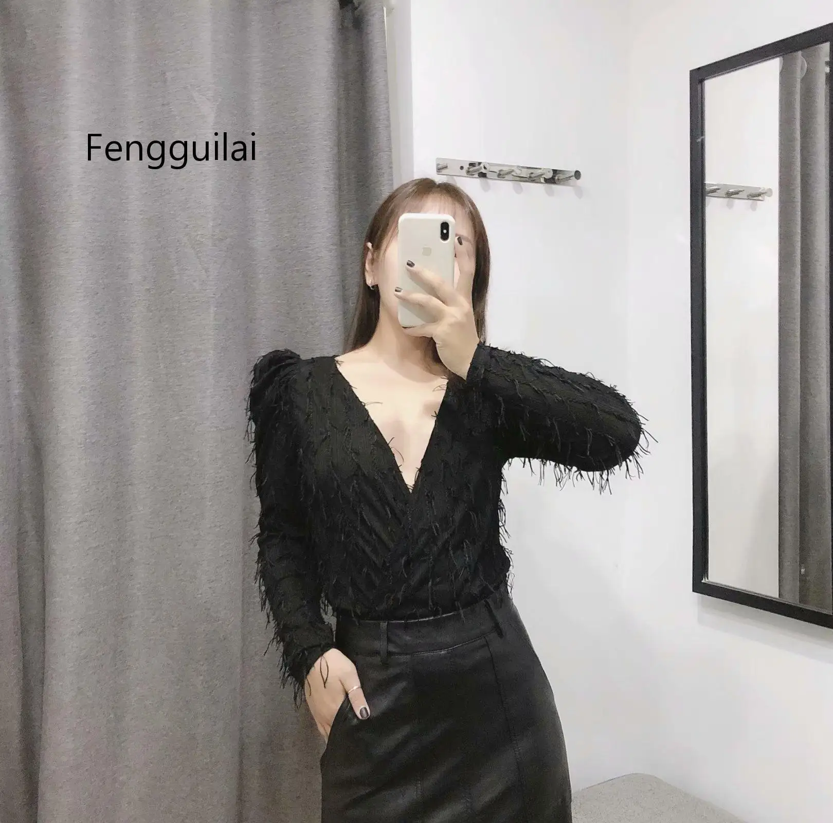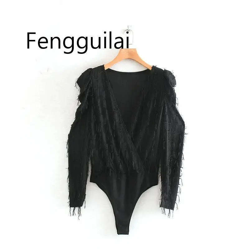 Images of 2020 New Autumn Winter Women's Sexy Tassel Decoration V-neck Long-sleeved Fashion Slim Piece Rompers Black Club Female Tops :