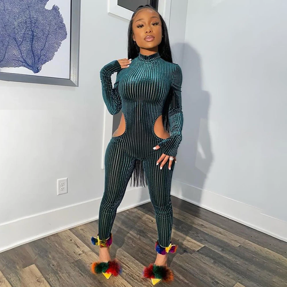New 2020 high quality green/red slim soft hollow out woman jumpsuit spring long-sleeve casual high street bodysuit body mujer