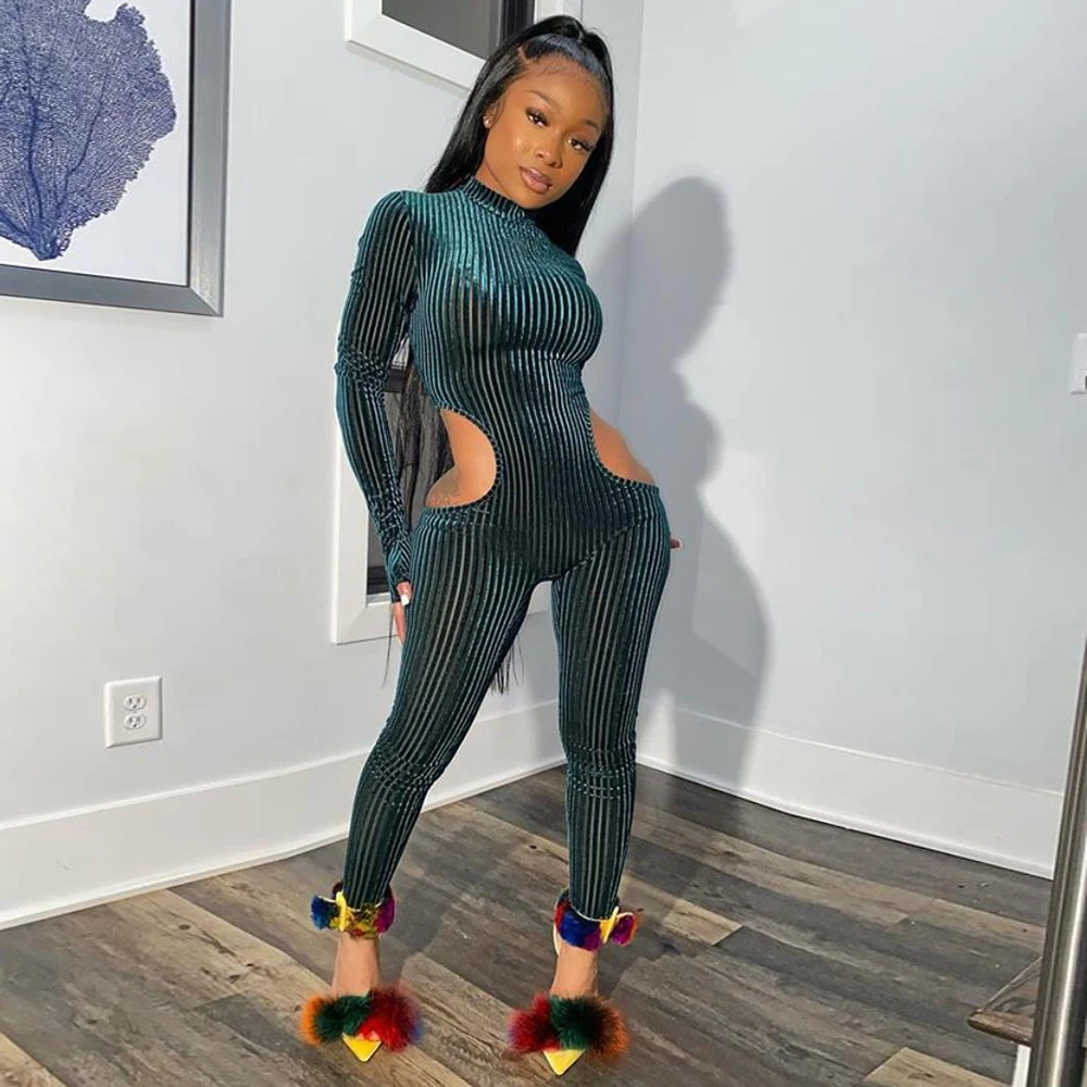 Images of 2020 high quality green/red slim soft hollow out woman jumpsuit spring long-sleeve casual high street bodysuit body mujer :