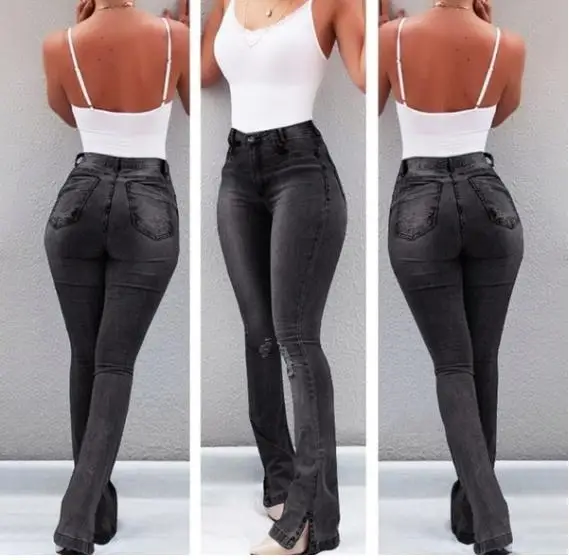 New Womens Bell-Bottom Jeans Skinny Bodycon Flare Pants Ripped Distressed Hole High Waist Slim Female Denim Trousers Casual Fat Mom