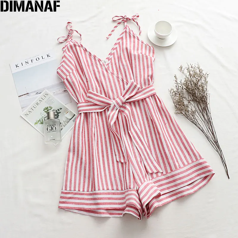 Sale DIMANAF Plus Size Women Playsuits Pants Striped Pink Summer Holiday Beach Style Loose Casual Trousers Sexy Lady Spaghetti Strap