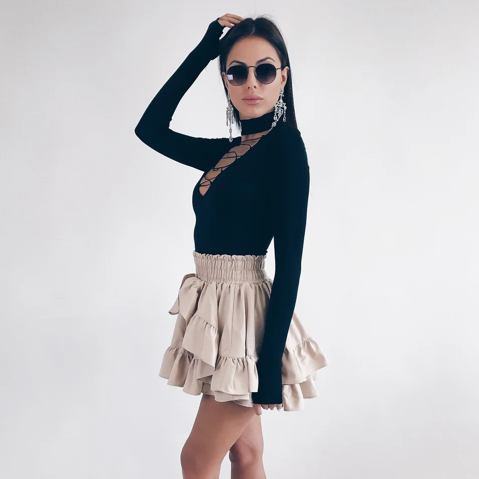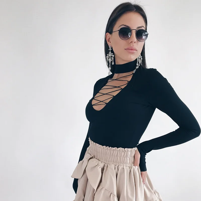 Images of Gothic Black Sexy Women O-Neck Splice Long Sleeve Lace Up Cross Hollow Out Bodyuits 2020 Goth Female Aesthetic Dark Slim Body :
