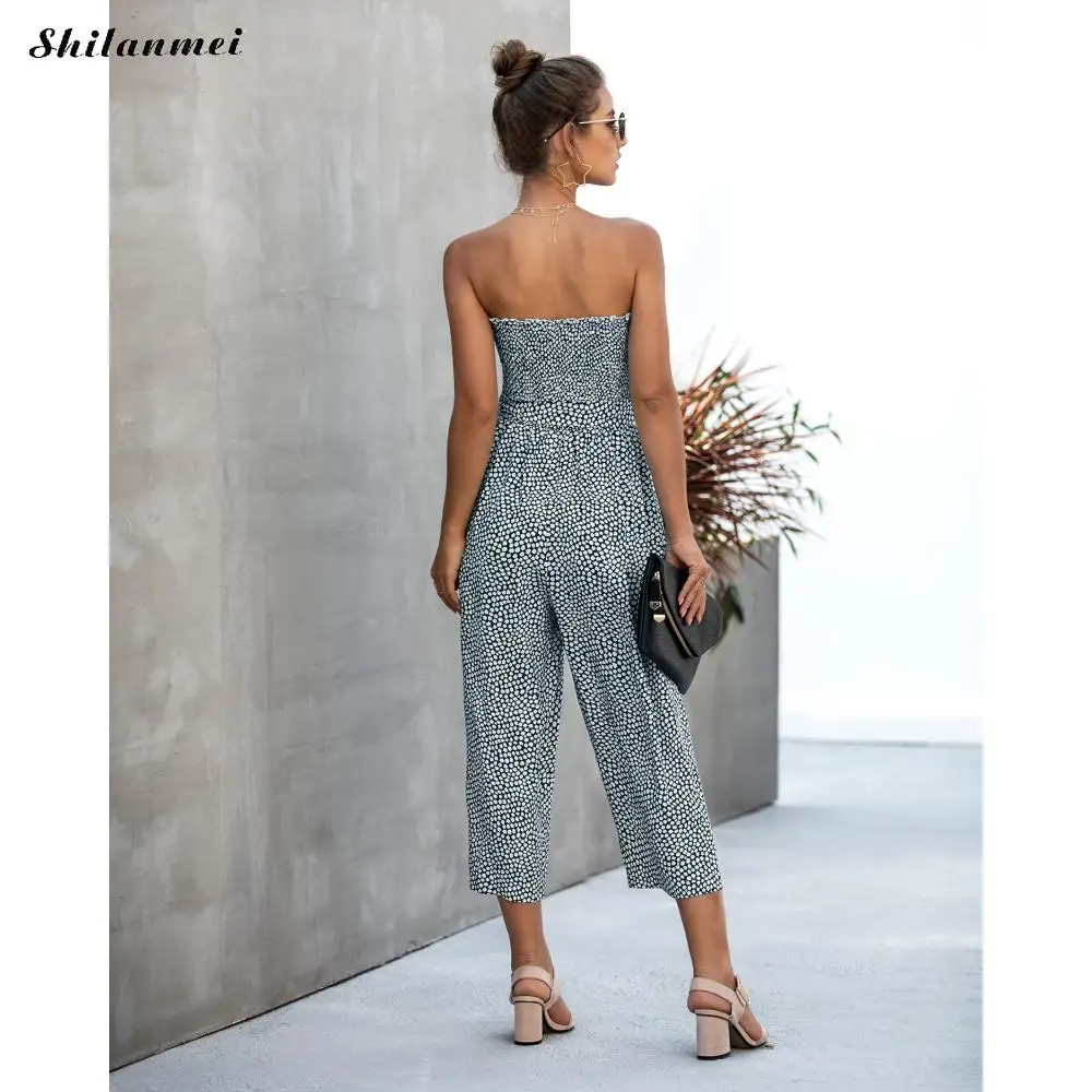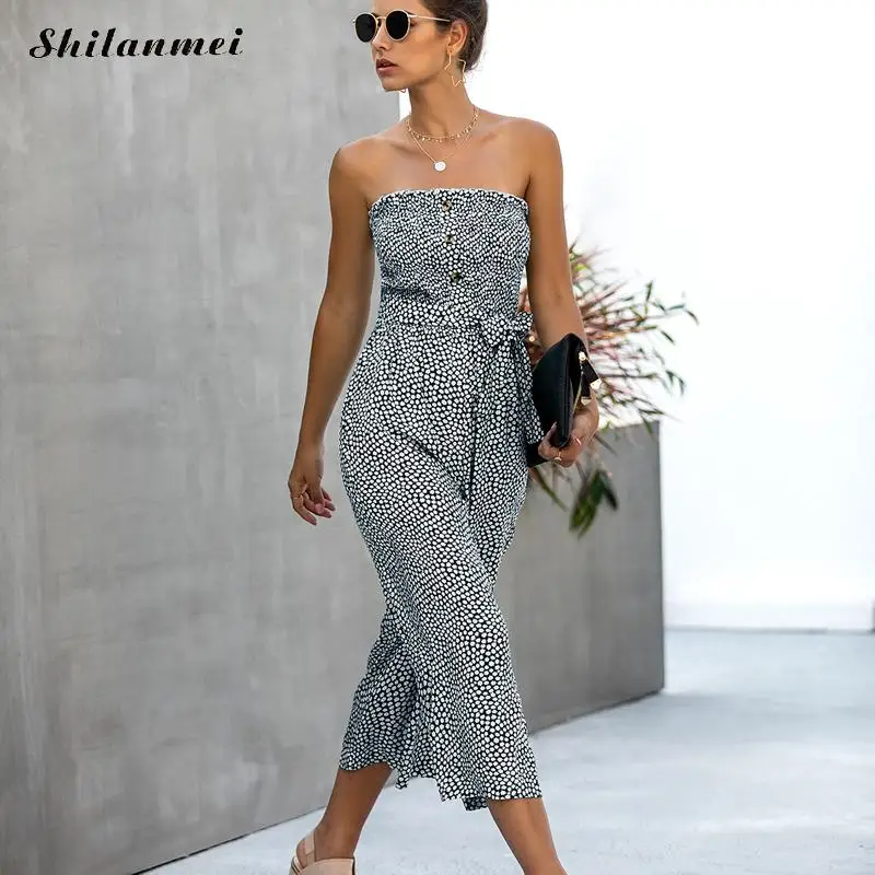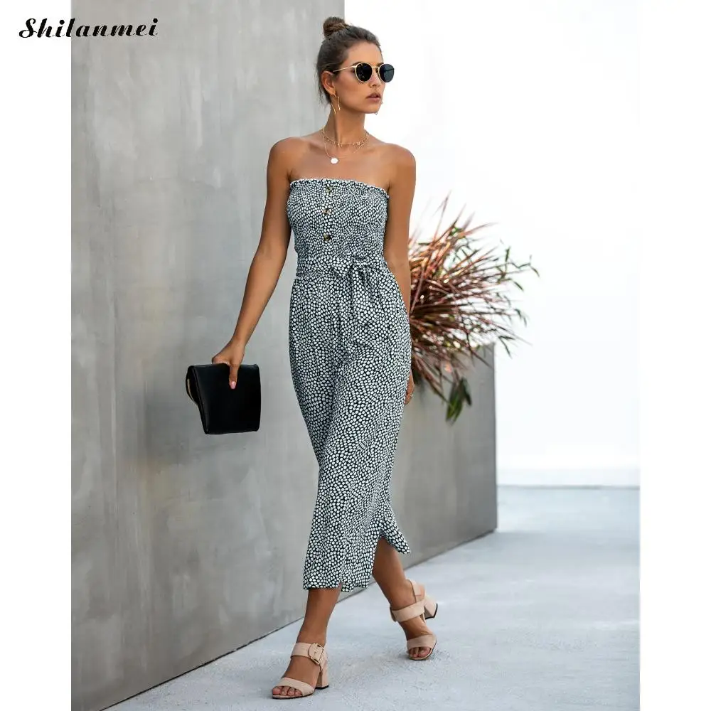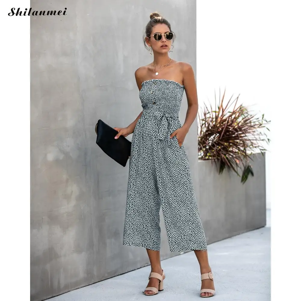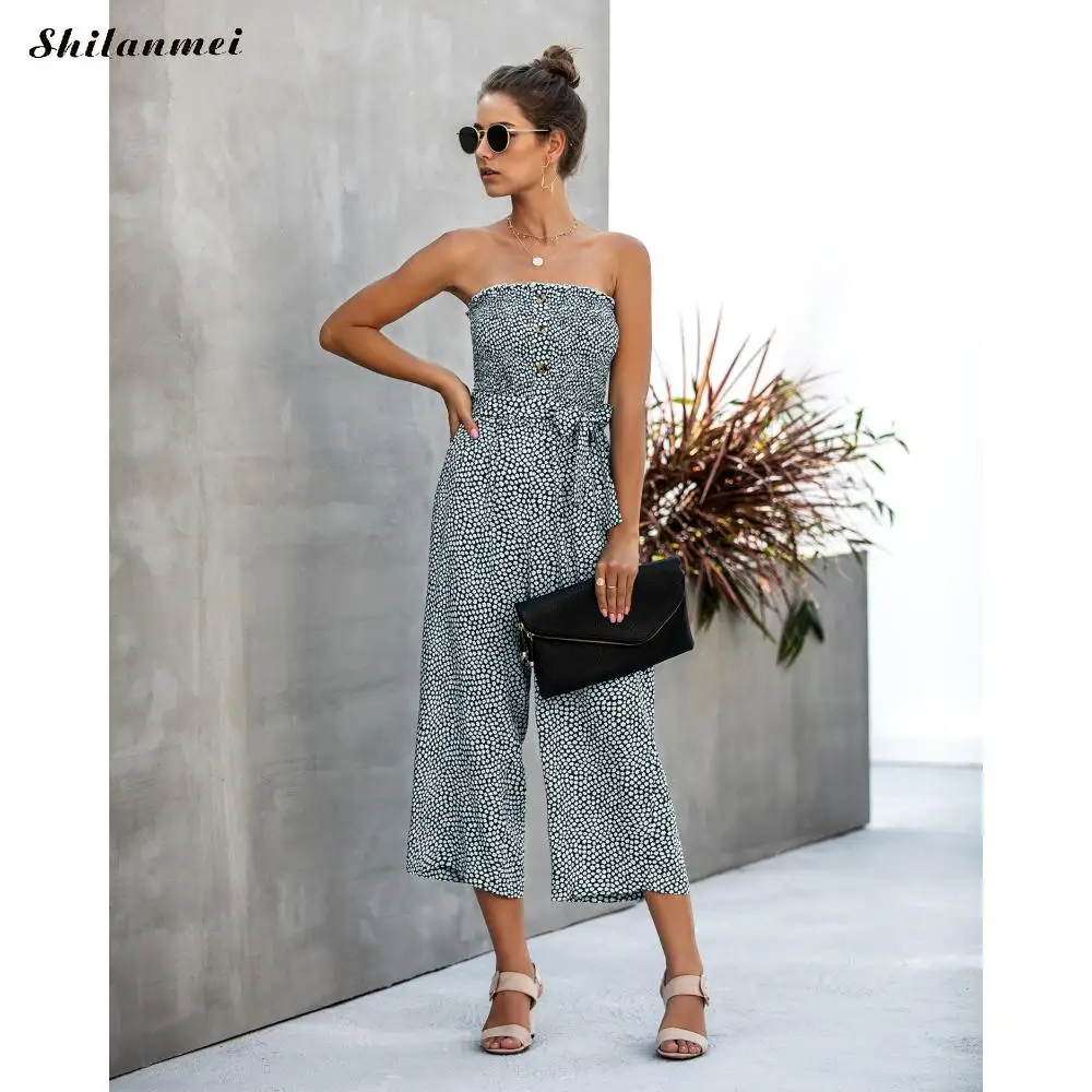 Images of 2020 Strapless Floral Print Women Jumpsuit High Waist Bow Tie Jumpsuit Romper Polyester Casual Buttons Wide Leg Ladies Overalls :