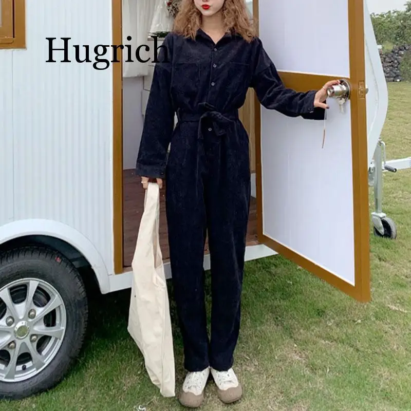 Images of 2020 Women brown khaki black corduroy jumpsuit turn down collar long sleeve button pocket casual solid winter autumn :