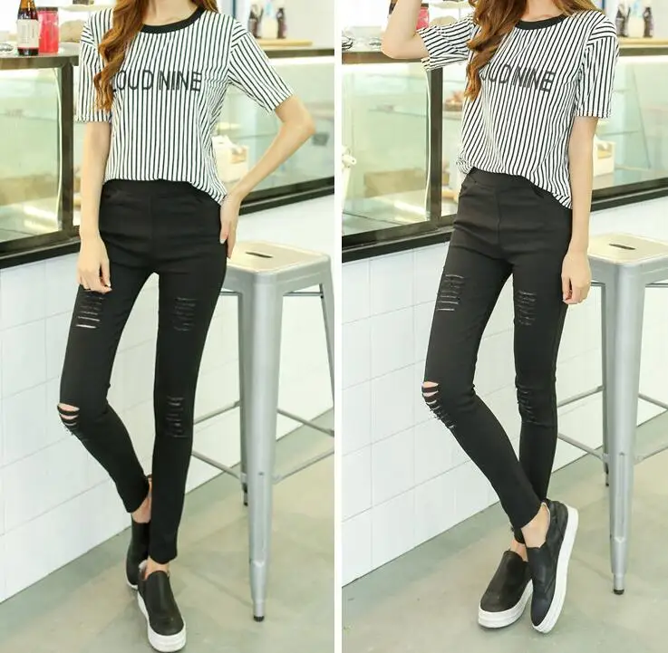 Images of 2019 Skinny Jeans Women Denim Pants Holes Destroyed Knee Pencil Pants Casual Trousers Black White Stretch Ripped Jeans :
