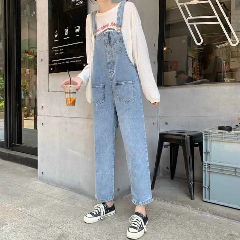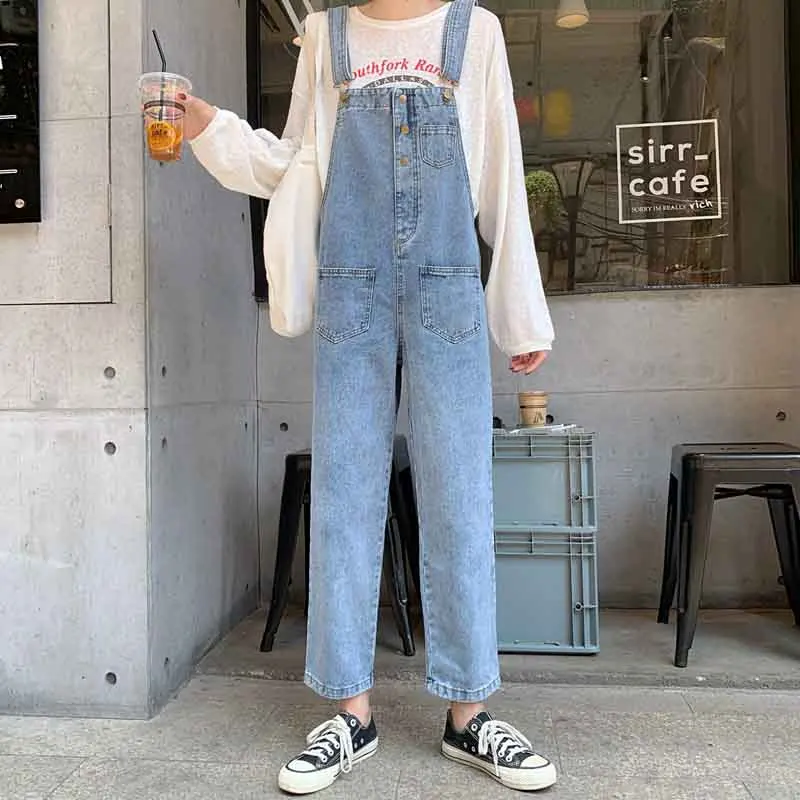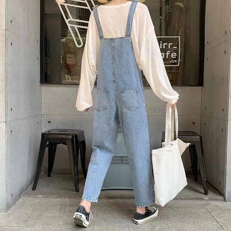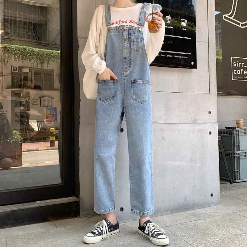 Promo Women Denim Jumpsuits Ladies Loose Jeans Rompers Jumpsuits Denim Bib Overalls Casual Single Breasted Suspender Jeans Jumpsuits