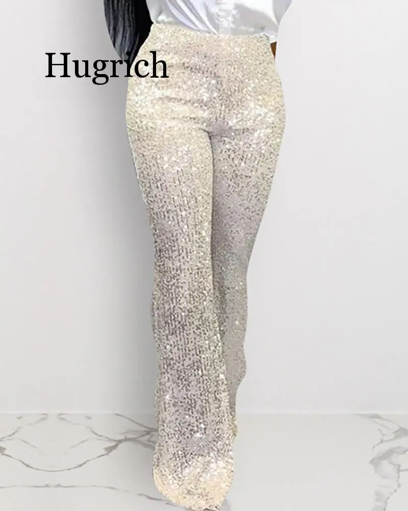 Images of 2020 Sequins High Waist Wide Pants Woman Glitter Silver Black High Waist Trousers for Female Party Dance Flared Legs Pants :