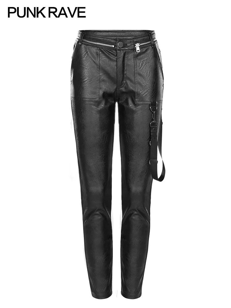 Images of PUNKRAVE Black Elastic High Waist Leather Pants Bib Slim Self-slim Casual Pencil Trousers Women Straight Autumn and Winter :